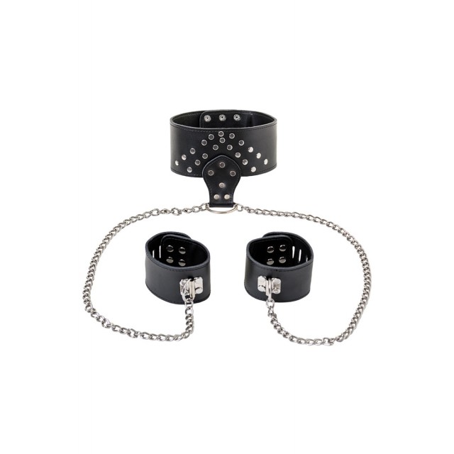 Этот стильный чёрный ошейник из натуральной кожи с блестящими заклёпками соединён 50-сантиметровой металлической цепью с мягкими кожаными наручниками.
