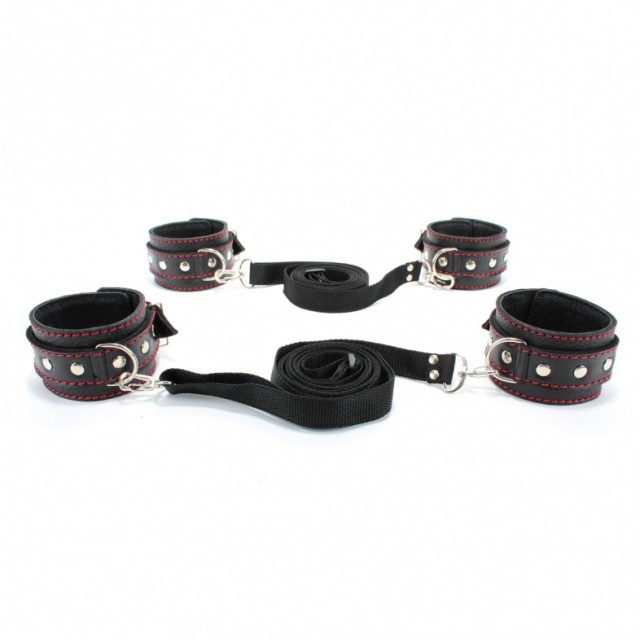 Набор для связывания состоит из наручников и оков, выполненных из натуральной черной кожи с контрастной красной строчкой, декорированных заклепками, двух бандажных ремней с карабинами.