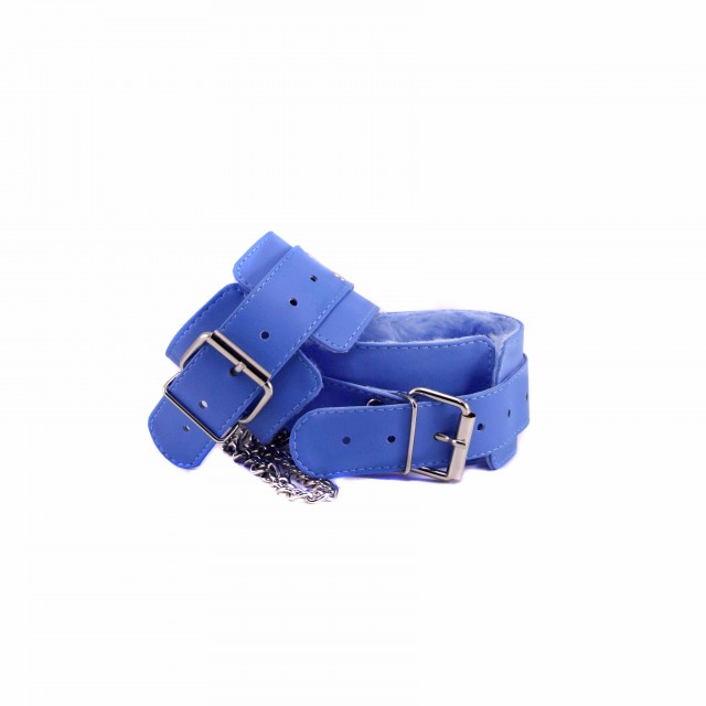 Оковы голубого цвета, изготовленные из кожзама. Внутри имеют меховую отделку для комфортного использования. Длина сцепки 34 сантиметра