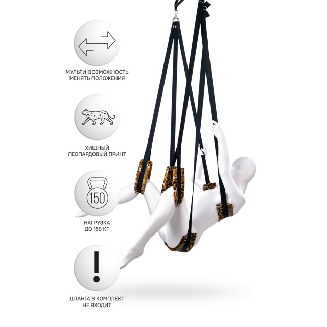 Все ремни регулируются, давая возможность бесконечно менять позы. Сидя, лежа, лицом или спиной к партнеру. Мягкие плюшевые подушки-опоры нежно обхватывают и поддерживают тело в любом положении. Леопардовый принт в сочетании с голой кожей партнера дополнит процесс изюминкой.