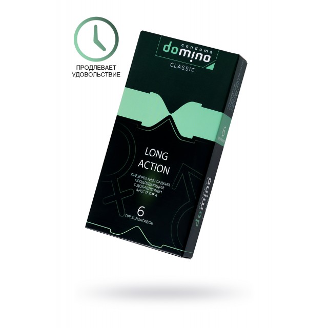 Для тех, кто хочет продлить любовную игру и насладиться ею в полной мере Luxe DOMINO CLASSIC создали презервативы Long action с пролонгирующим эффектом! С ними вы забудете о времени и будете погружены в близость с партнером так долго, как вы этого захотите. Гладкие презервативы с накопителем из высококачественного латекса в смазке с добавлением анестетика. Презервативы Luxe DOMINO изготовлены с тщательным соблюдением европейских технологий качества и прошли электронную проверку на прочность и целостность материалов. Luxe DOMINO CLASSIC Long action позволят продлить наслаждение и не думать о времени, не подведут в самый ответственный момент. Вам не придется думать о том, что он будет скатываться или соскальзывать. Презервативы Luxe DOMINO CLASSIC Long action – открой свои возможности по-новому – продли удовольствие себе и партнеру. Номинальная длина – 18 мм, ширина - 52 мм, толщина стенок - 0,06 мм. В стильной фирменной упаковке 6 штук